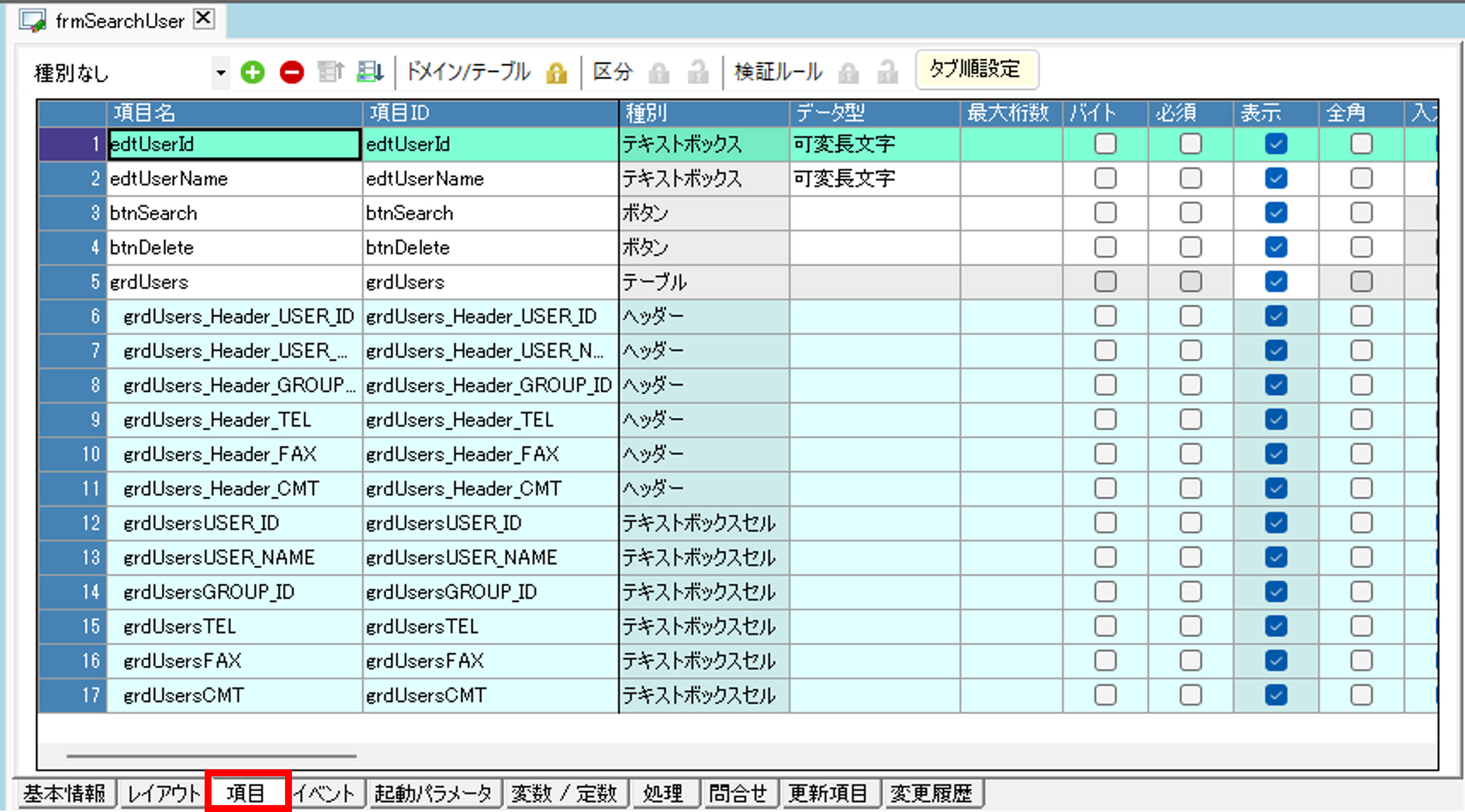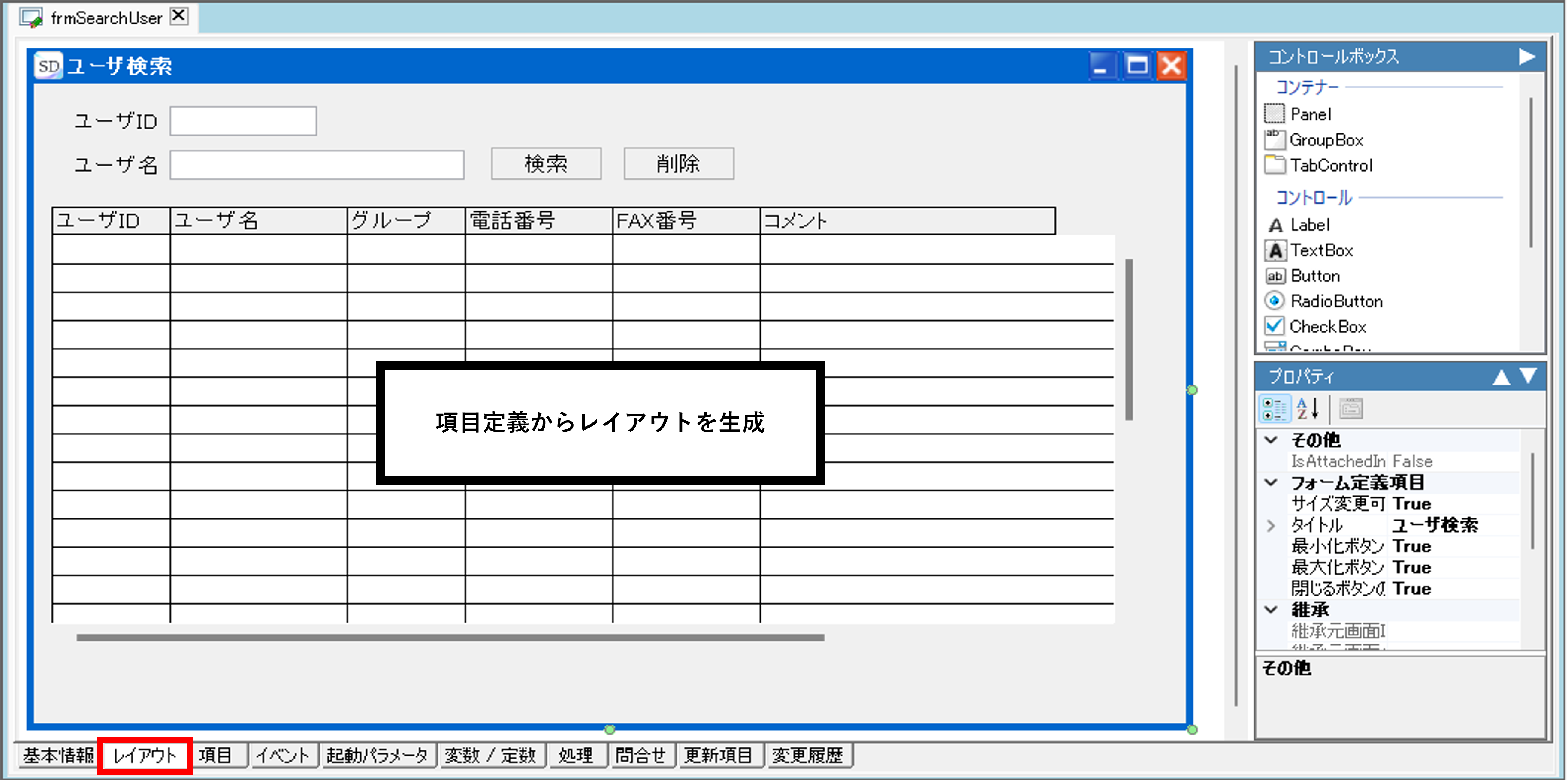 フォーム定義を解析し、画面項目一覧とレイアウトイメージを生成。