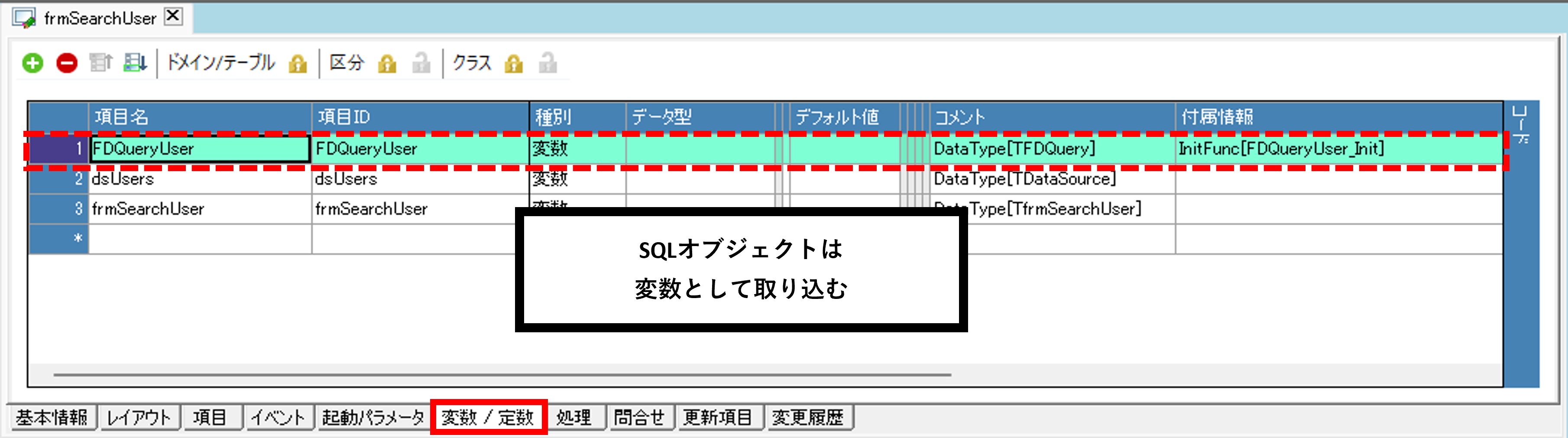 SQLオブジェクトは変数として宣言し、対応する初期化処理の名称を明記。