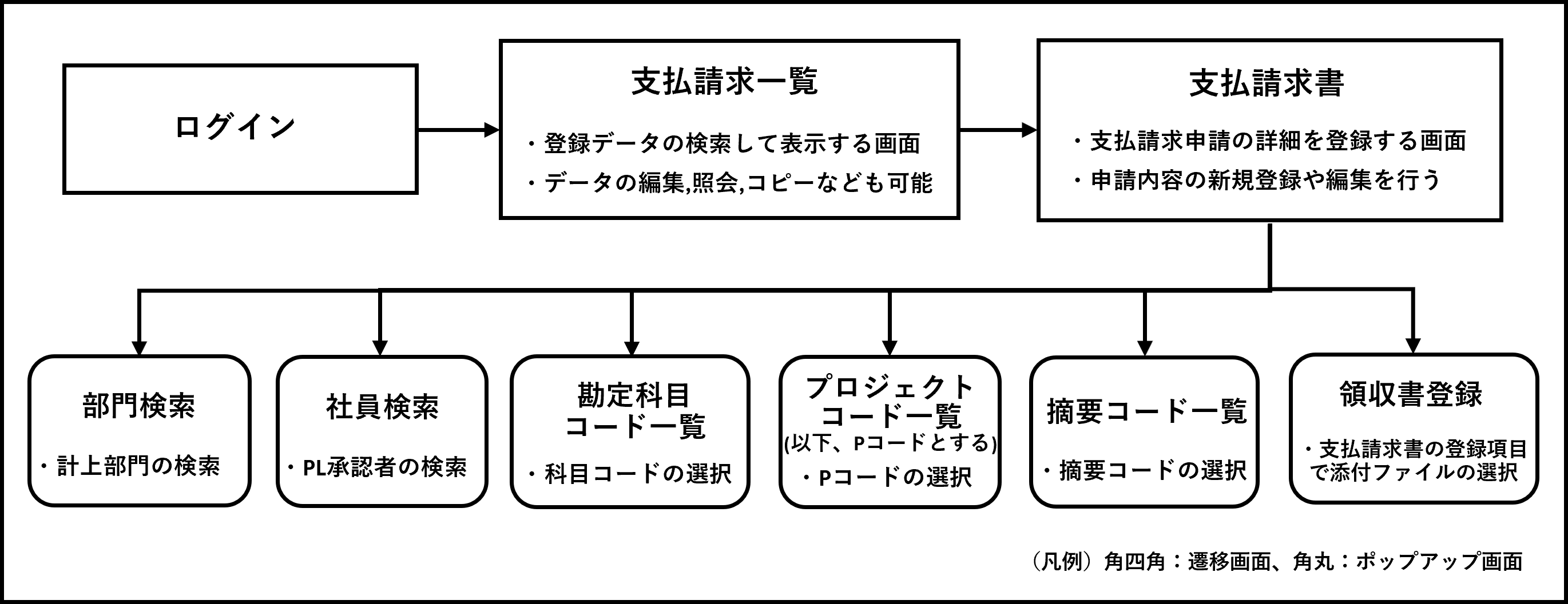 以下に、支払請求システムの画面遷移図を掲載しますので、全体の流れをご確認ください。