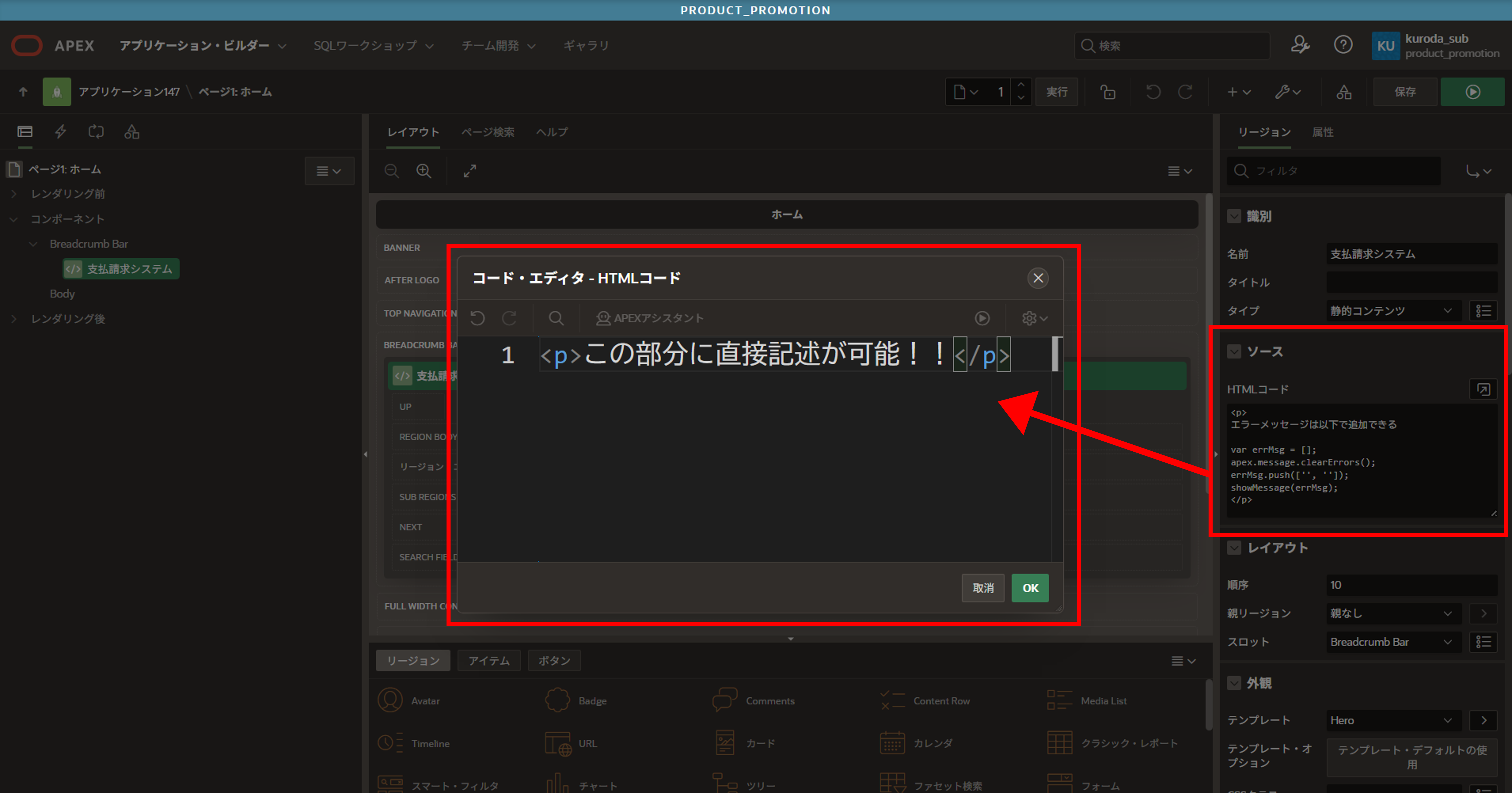 Oracle APEXでは、HTMLを記述する方法がいくつかあり、上記画像ではリージョン(例:静的コンテンツ)という枠に対して直接記述する方法を挙げています。