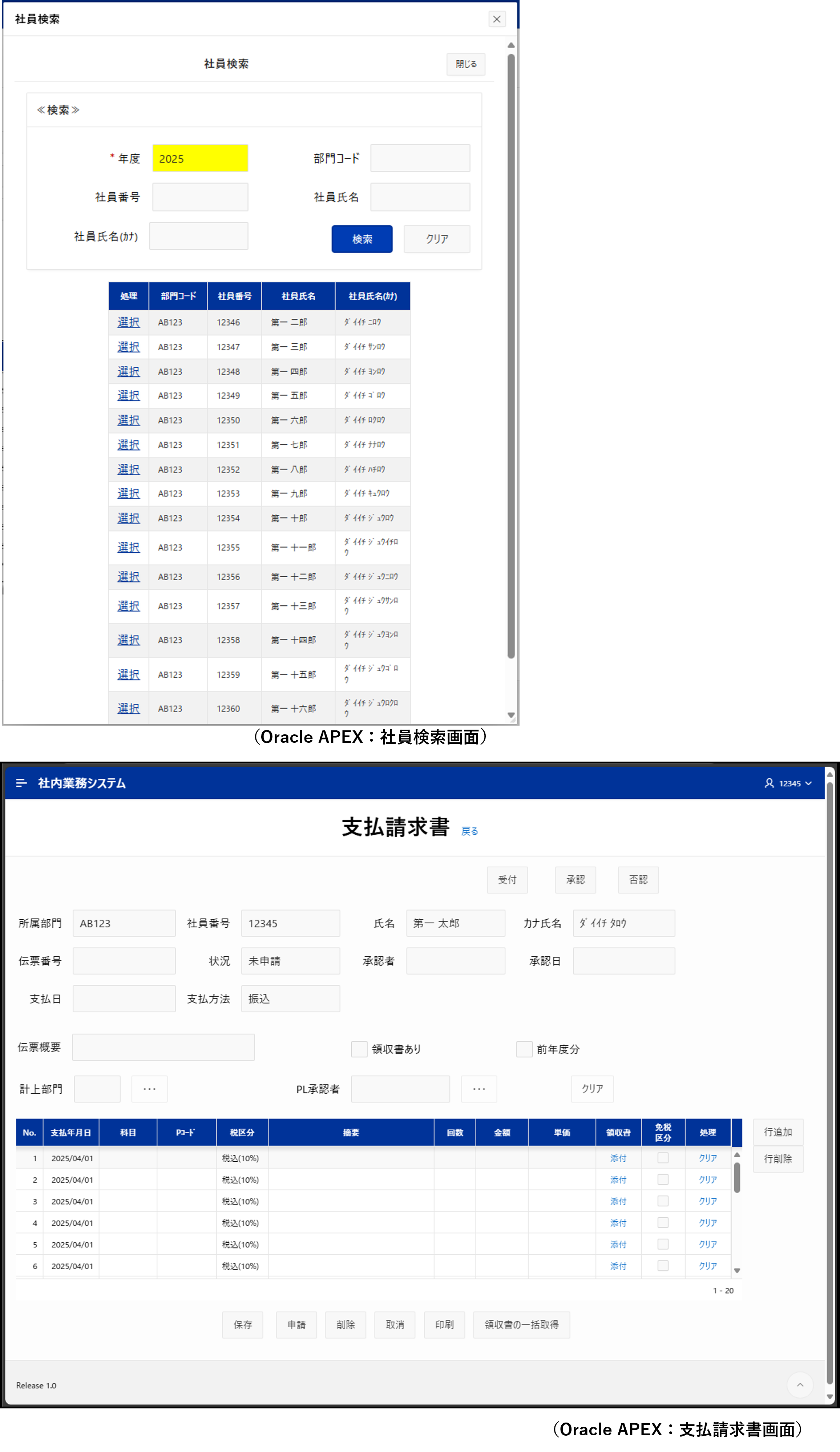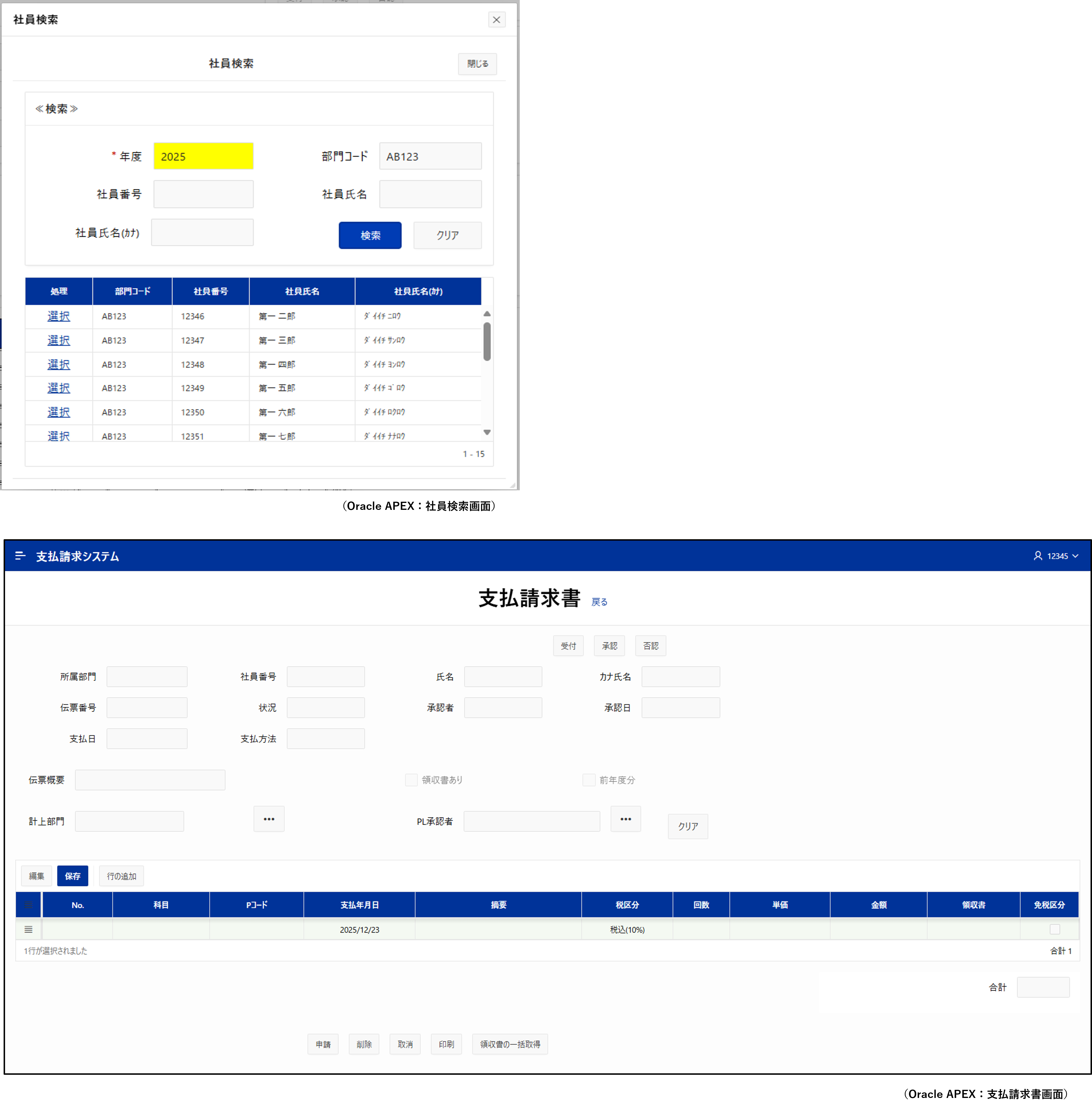 次節では、Oracle APEXに標準で備わっている機能を活用してどこまで再現できたのかについて、支払請求書画面と社員検索画面を例に具体的な構成を見ていきます。