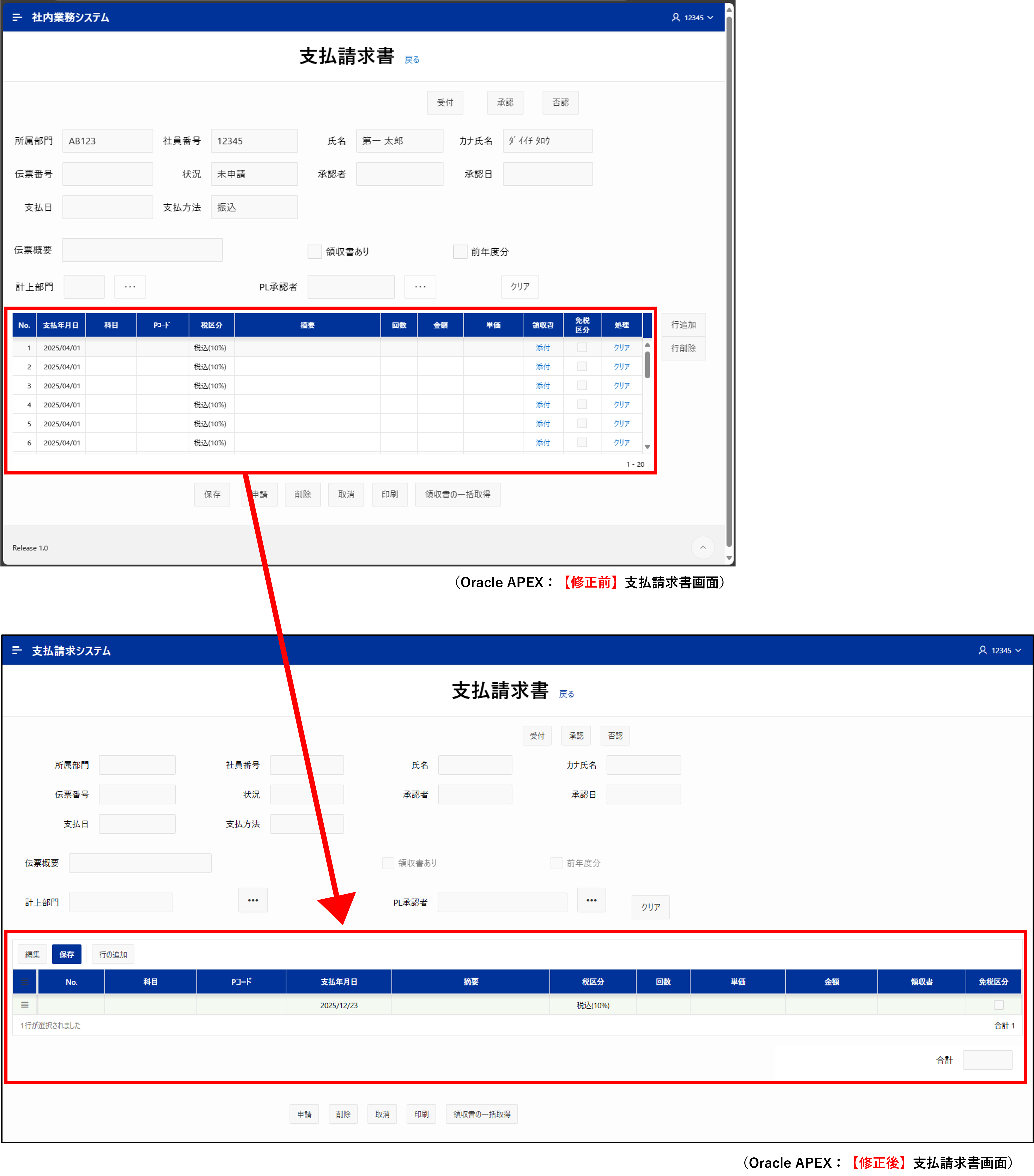 技術的対応を経て、支払請求書画面と社員検索画面をOracle APEX上で再現することができました。