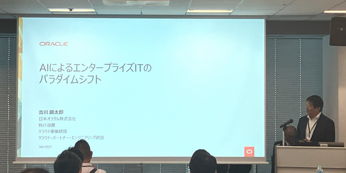 まず初めに、日本オラクル株式会社より「AI時代に向けた基幹システムのモダナイゼーションの最新動向」についてご講演いただきました。今後のAI活用において、生成AIと組み合わせる「データ」の重要性を改めて実感する、学びの多いお話を伺うことができました。